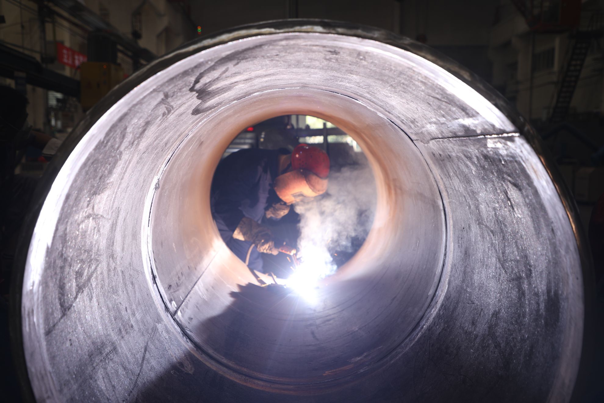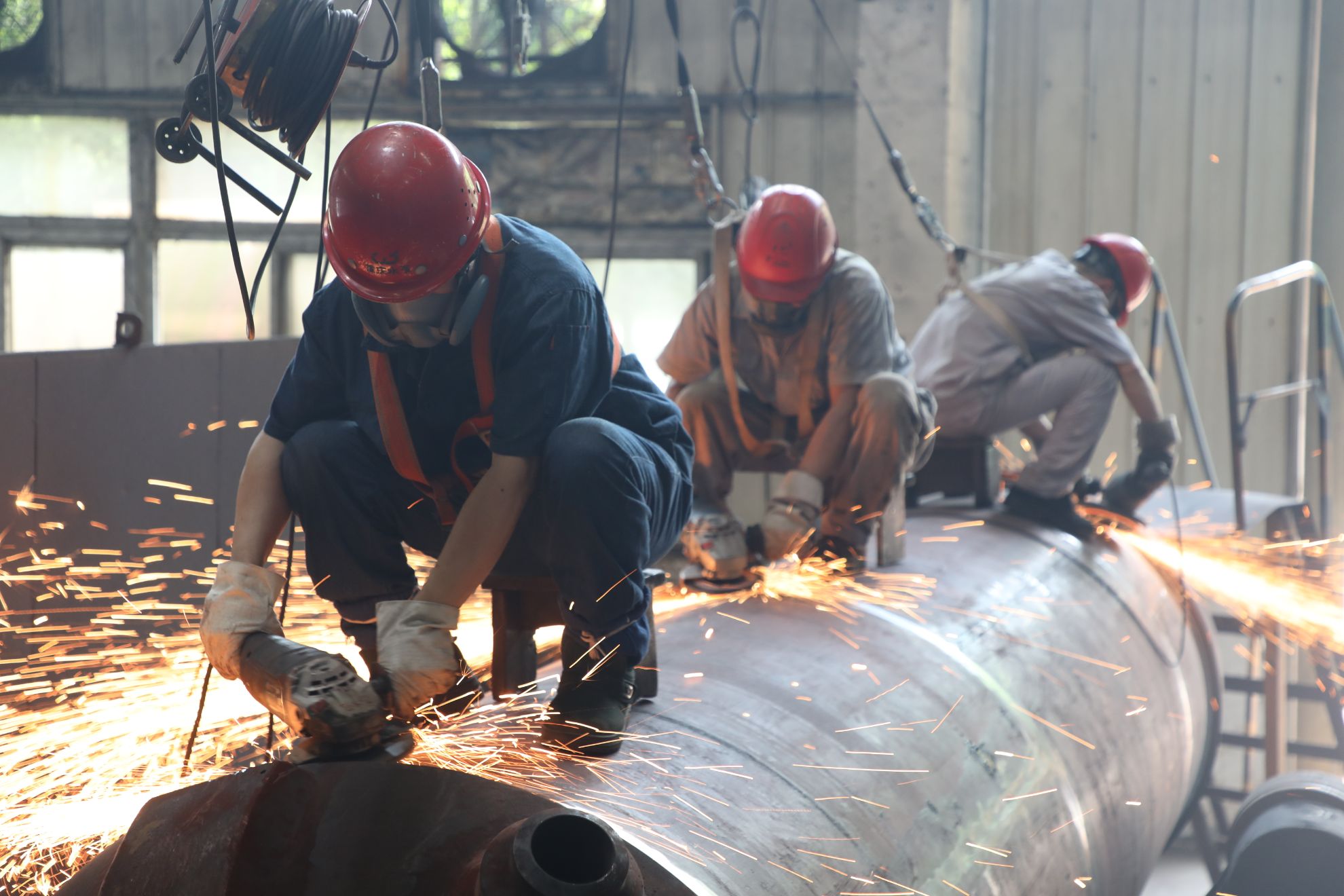 容器車間內(nèi)焊接區(qū)域的師傅們身著厚重的裝備細(xì)致地打磨著工件,盡管熱浪不斷地涌向車間,汗水浸濕了黃順兵的衣衫,工作服濕了又干,干了又濕,但師傅們依舊聚精會神地站在生產(chǎn)線上,目光里滿是認(rèn)真專注。